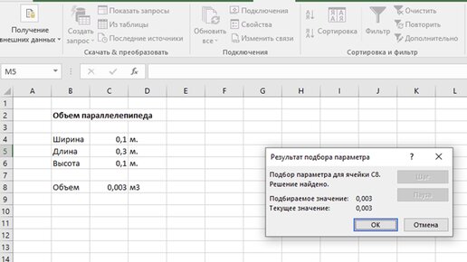 Всем привет! В этой статье разберем применение такого функционала Эксель как «Подбор параметра». Для разбора этого функционала давайте создадим файл, который рассчитывает объем прямоугольного параллелепипеда, имея данные высоты, ширины и длины. В таком виде: А теперь давайте попробуем решить такую задачу: Какая должна быть высота параллелепипеда, что бы его объем равнялся 1678 м3? Конечно, мы можем вручную подобрать нужное значение высоты. А можем воспользоваться «подбором параметра». Для этого...