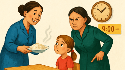 Наш садик живет в каком-то своем часовом поясе. Завтрак строго в 8:30. Если я приведу ребенка к этому времени, мне потом полтора часа слоняться по улице или сидеть в машине — домой возвращаться нет смысла, а на работе еще закрыто. Я приноровилась приводить дочку Соню к 9:00. Это идеально для моего графика. Прошу воспитателей – оставьте, пожалуйста, завтрак. Соня придёт, поест. Но тут начинается лотерея. Если смена "доброй" воспитательницы, Людмилы Петровны, то тарелка с кашей ждет нас на столе, заботливо прикрытая салфеточкой...