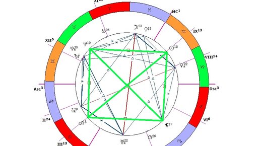Большой квадрат, он же Большой крест или Крест судьбы – очень напряженная фигура, содержащая большое количество энергии. Состоит из 4 квадратур (90 градусов) и 2 оппозиций (180 градусов). Такое количество энергии наделяет человека динамичностью, напористостью и силой, но обязательно требует выхода. И если человек ведет пассивный образ жизни, то избыточная энергия начнет разрушать его изнутри. Человек с этой конфигурацией рано взрослеет, формирует свое мировоззрение и кристаллизуется. Уже с детства он пытается найти себя в разных сферах деятельности...