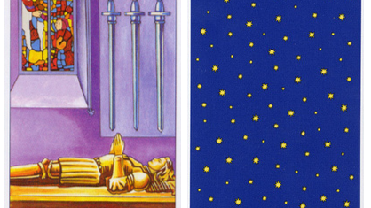 На Четверке Мечей изображен покойник, находящийся в контрасте с яркой и живой сценой за окном. Некто решил взять тайм-аут и отдохнуть от мира.