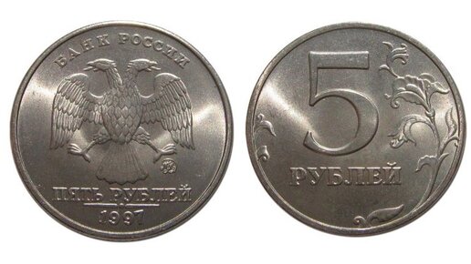 5 рублей 1997 года является экземпляром нового дизайна монет после деноминации. Не смотря на то, что написано 1997 год, чеканка началась только в начале 1998 года. Характеристики практически не изменились: 5 рублей 1997 года ММД. У этой монеты существует только одна разновидность - это штемпель 1.1. Он совпадает и для ММД, и для СПМД. Обе разновидности часто ловятся в обороте и высокой ценности не представляют. Их цена составляет около 100 рублей, но при очень хорошем состоянии может достигать 1000...