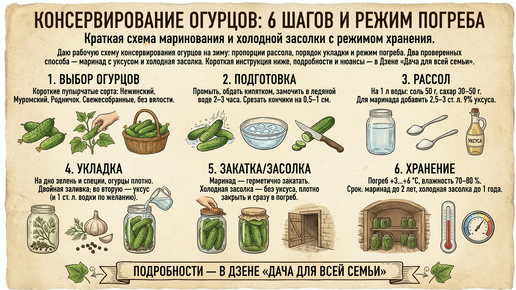 Коротко по сути. Для консервирования огурцов на зиму я рекомендую две рабочие схемы: 1) маринование с уксусом (3 ст. л. 9% на литр рассола, соль 50 г, сахар 30-50 г) и 2) холодная засолка без уксуса с укропом, хреном и листьями — под погреб +3…+6 °C. В обоих случаях огурцы предварительно вымачиваю 2-3 часа в ледяной воде и срезаю кончики на 0,5-1 см — хруст лучше и рассол проникает равномерно. Для хранения в погребе поддерживаю температуру +3…+6 °C и влажность 70-80 %, проверено: банки стоят без вздутия, рассол прозрачен до двух лет...