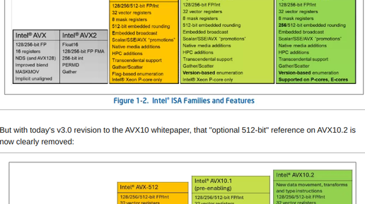 Intel обновила свой технический документ AVX10 и связанные с ним исправления компилятора с открытым исходным кодом вокруг этого следующего стандарта Advanced Vector Extensions... Хотя AVX10 намеревался разрешить либо 256-битные, либо 512-битные режимы в зависимости от возможностей процессора, Intel отказалась от подхода только с 256-битными режимами и перешла на 512-битные режимы везде. Таким образом, это, по-видимому, указывает на то, что ядра Intel E будущего будут должным образом поддерживать...