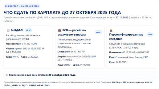 6-НДФЛ, РСВ и СЗВ: зарплатная отчётность за III квартал 2025 года