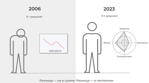 Первый раз — 600 000 рублей (2006). Второй — $60 000 (2023). Разница не в валюте. Разница — в состоянии. Я был недавним выпускником и жил по шаблону, где контроль был внешним: начальник, правила, инструкции. Потом я открыл трейдинг — и быстро понял: здесь бессмысленно пытаться контролировать рынок. Единственное, что реально поддаётся контролю, — моё состояние и решения. Полгода тестов. Три месяца стабильной прибыли. Чувство: «я гений». Я закинул на счёт всё, что было. Занял у друга годовую зарплату...