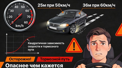 Типичный водитель думает, что 60 км/ч в городе — это медленная, безопасная скорость. На самом деле это одна из самых опасных скоростей. Объясняю физику и даю рекомендации. Почему 60 км/ч — это ловушка 60 км/ч кажется медленной и безопасной. Ты думаешь: "Это не скоростная езда, это обычный темп". На самом деле 60 км/ч в городе — это опасная скорость, потому что: Статистика: при 60 км/ч в городе больше ДТП, чем при 50 км/ч, потому что люди теряют внимание. Физика торможения — почему 60 опаснее, чем 50 Вот важный момент: тормозной путь растёт не линейно, а квадратично...
