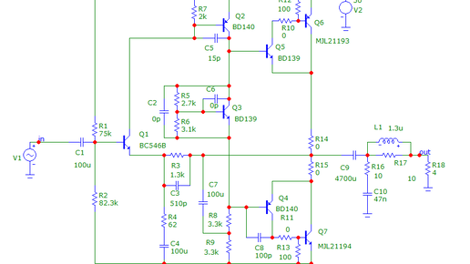 Схема из сайта https://vpayaem.ru/amp65.html Выше представлена схема модели. На конденсаторы С2, С6, резисторы R10, R11 - с номиналом 0 не обращайте внимания. Могут понадобиться при настройке. R14, R15 , которые ставят для стабилизации теплового режима, сильно увеличивают коэффициент гармоник. Поэтому тоже не нужны. Отсутствие этих резисторов накладывает ограничение на напряжение питания - для обеспечения надежности оно должно быть не выше, указанного на схеме. Так же неплохо позаботиться о хорошем...