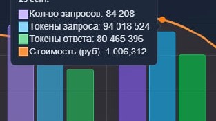 Сколько токенов в сутки на ИИ тратим мы. Вот, 160 млн. за 23 сентября, совокупно. Цена вышла нам за этот день 1000 р. Другими словами - мы за 1000 р. в день обработали суммарно 160 млн. токенов (вход + выход)...