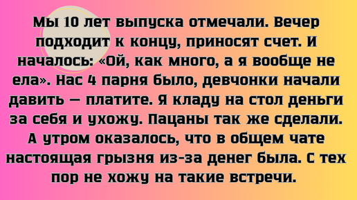 Есть в жизни события, к которым готовишься, как к экзамену, но всегда идешь, как на праздник. Каждый из нас, кто решился пройти через встречу выпускников, знает: за такими моментами скрываются истории, достойные голливудского фильма. Здесь и внезапные признания в любви, и неловкие провалы, и грандиозные повороты судьбы. Готовы увидеть, как изменились ваши одноклассники, и вспомнить свою школьную любовь? Листайте, чтобы узнать, что на самом деле происходит...