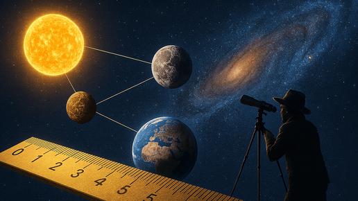 Когда мы говорим о расстояниях в космосе, километры быстро теряют смысл. Ведь уже до Луны их почти четыреста тысяч! Поэтому астрономы придумали свои «линейки»: лунное расстояние, астрономическую единицу и световой год. Эти величины помогают не сойти с ума, глядя на числа с одиннадцатью нулями. Лунное расстояние (LD) — это дистанция от Земли до Луны: примерно 384 400 километров. Если бы вы могли ехать на машине со скоростью 100 км/ч без остановок, вы бы добрались туда примерно за 160 дней. Астрономы...