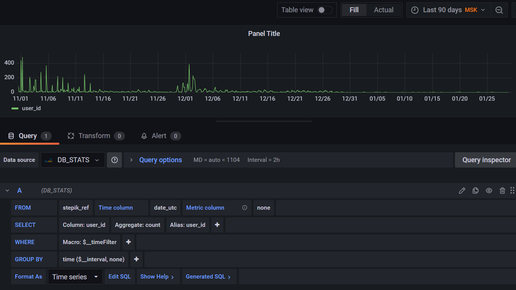 Предыдущая статья цикла - здесь Отображение "величина - время" Самым простым является отображение зависимости величины от времени. Для этого обычно используются панели типа Time series или Bar chart. В принципе, панель Stat в фоне также отображает график. Тип Time Series является типом панели по умолчанию. При добавлении новой панели у вас на экране появится вот такая таблица, которую надо заполнить нужными параметрами. Типы полей таблицы вы можете посмотреть на скриншотах предыдущей статьи серии...