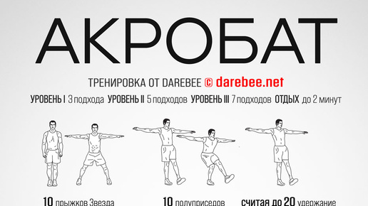 Новый релиз / домашняя финес-тренировка — Акробат. Акробат - изометрическая фитнес-тренировка. ЦЕЛЬ: все тело ТИП: растяжка СЛОЖНОСТЬ: 4 — НЕ подходит для начинающих https://darebee.net/acrobat-workout...