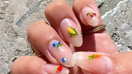 В соцсетях набирает популярность новый тренд. Касается он, как вы уже догадались, маникюра. Свежее направление нэйл-дизайна получило красивое название Al Fresco, что в переводе с итальянского означает "под открытым небом", или "на свежем воздухе". 🌻 Ногти покрываются прозрачным лаком. И на них наносятся небольшие рисунки, напоминающие о летних днях в саду или на собственном огороде. Тут и цветы, и фрукты, и бабочки, и жуки, и божьи коровки. А ещё спелые овощи, которые, кажется, только-только достали из земли...