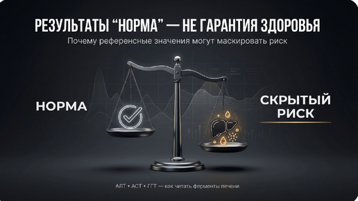 Анализ крови показал «всё в норме». Врач кивнул. Вы выдохнули. Но что, если нормы лгут? Лабораторные референсные диапазоны рассчитаны по популяции, в которой 30-40% людей уже имеют метаболические нарушения. «Норма» — это среднее по палате, включая тех, у кого уже идёт жировая болезнь печени. До 79% пациентов с неалкогольной жировой болезнью печени (НАЖБП) имеют «нормальный» АЛТ (Browning JD et al., Hepatology, 2004). Три фермента — АЛТ, АСТ и ГГТ — рассказывают разные истории. Если уметь их читать...