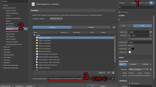Для начала надо найти уже готовые (кем то созданные) и выложенные в свободный доступ (например на github) шаблоны. Они имеют расширение файла .DwsDot (процесс поиска описывать не буду). Далее необходимо скопировать скачанные файлы .DwsDot в папку в которой Altium по умолчанию хранит свои шаблоны. Обычно это папка "C:\Users\Public\Documents\Altium\AD21\Templates\". Как найти папку хранения шаблонов на картинке...