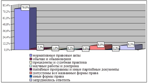 Актуальность данного исследования заключается в том, что анализ действующего законодательства, научной литературы[1] и эмпирических данных со всей очевидностью показал необходимость концептуального обновления теории нормативных актов. Цель проведенного социологического исследования: выявить отражение в правовом сознании государственных служащих понятия системы нормативных актов и перспектив ее развития. Такой подход позволяет исследовать восприятие в правовом сознании респондентов правовых понятий, которые юридической наукой позиционируются едва ли не как абсолютная истина...
