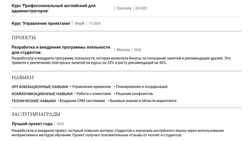 Представленный пример резюме администратора школы английского языка — это ваш готовый инструмент для понимания структуры и содержания. Используйте его, чтобы составить эффективное резюме, которое приведет вас к успешному трудоустройству. Здесь вы найдете не просто готовые примеры резюме администратора школы английского языка как для начинающих, так и для опытных специалистов, но и подробные пошаговые инструкции: ✅ Изучив пример, вы сможете создать резюме с помощью нашего конструктора резюме. Заголовок резюме должен четко отражать вашу специализацию и уровень профессионализма...