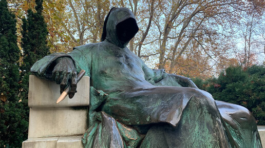Всем привет, я Наташа и я путешественница. Совсем недавно я была в Будапеште и по уши влюбилась в этот город! Если вам он тоже нравится, маякните в комментариях, всегда приятно найти единомышленников. Так вот, в Будапеште есть очень интересный памятник (и даже, я бы сказала, устрашающий на вид) - это статуя Анонимус на территории замка Вайдахуняд. Вот так выглядит этот памятник. Голова «Анонимуса» скрыта капюшоном от людских глаз, какая бы погода не была и какое освещение бы ни было. Со стороны складывается ощущение, что под капюшоном вообще пусто, так как всё абсолютно чёрное...