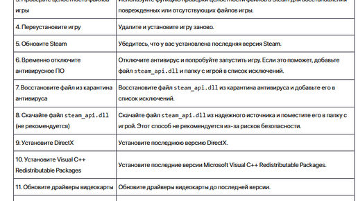 Ошибка, связанная с файлом steam_api.dll, обычно указывает на проблему с установкой, целостностью или совместимостью Steam или игры, требующей Steam API. Этот файл является частью Steamworks SDK и используется играми для интеграции с функциями Steam, такими как достижения, статистика, мультиплеер и защита от пиратства. Вот подробное описание ошибки и способы ее исправления: Вот таблица с кратким описанием способов исправления ошибки steam_api...