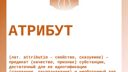 (лат. attributio – свойство, сказуемое) – предикат (качество, признак) субстанции, достаточный для ее идентификации (узнавания, распознавания) и необходимый для ее существования. Говоря иначе, атрибут – это то, что в традиционной логике называют отличительным признаком вещи (differentiae), с той, однако, разницей, что, говоря об атрибутах вещи, подразумевают не видовое, а субстанциальное отличие: «любая разница, созданная какими угодно отличиями, составляет инаковость; но нечто другое получается только в том случае, когда две вещи разделены субстанциальным отличием» (Боэций...