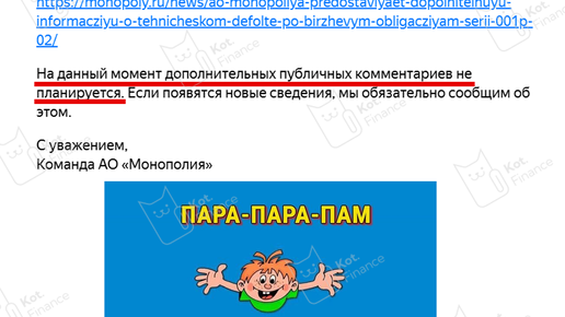 Мы (авторы Кот.Финанс) в банковском бизнесе давно. И если заемщик планирует вернуть долг (не «когда-нибудь» а вот-вот), то он охотно идёт на контакт, называет конкретные причины проблем, и свои ожидания в самом ближайшем будущем (поступление средств от заказчиков через пару дней). А если возврат кредита не в приоритете – заемщик будет держать дистанцию и «сливать» разговор. Вчера вечером на Smart-Lab Монополия почти сразу опубликовала пресс-релиз, за что спасибо. И мы отправили сегодня вопрос, планируется ли новый комментарий по вопросу просрочки...
