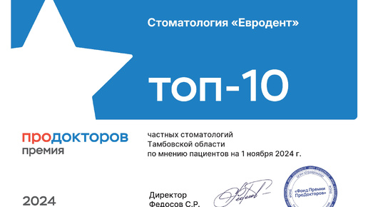 Премия Продокторов Мы стали победителями премии ПроДокторов ТОП-10: почему для нас это важно Недавно наша клиника «Евродент Тамбов» вошла в ТОП-10 клиник региона и стала победителем премии ПроДокторов в номинации