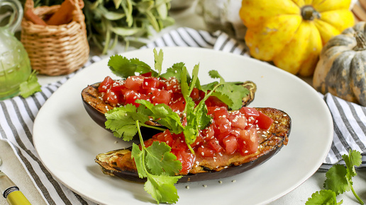 «Баклажан» по-английски – «еggplant» или «растительное яйцо». Когда это название только появилось, самым популярным сортом были баклажаны, похожие на небольшие белые плоды, которые выглядели, как куриные яйца. Вес готового блюда на 2 персоны: 740 г Готовить: 20-25 мин. Шаг 1 Разогрейте духовку до 200 гр. Баклажан разрежьте пополам вдоль. Внутри сделайте глубокие надрезы, но не прорезайте до конца. Разогрейте сковороду с 1 ст.л. растительного масла и обжарьте баклажаны по 2-3 мин не переворачивая до золотистой корочки на среднем огне, прижимая к сковороде лопаткой...