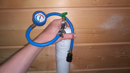 Во-первых, начну с рассказа про сам комплект. Он прямо максимально простой: баллон с фреоном R-134 и заправочный шланг. На одном конце шланга запорный кран,...