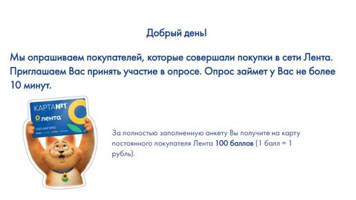Добрый день, дорогие читатели! Сегодня расскажу вам об очень простом способе заработать 50-100 баллов, т.е. рублей, на баланс карты Лента. Речь идет о заполнении опросов, которые от них периодически приходят. Сегодня на почту пришло письмо, в котором была ссылка на опрос. Ссылка, к сожалению, персональная, и опросы приходят рандомно, не всем покупателям одновременно. Однако я предлагаю проверять периодически почту на предмет этих опросов и сразу их заполнять, пока не закончится лимит, т.к. желающих может быть довольно много...