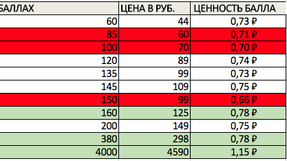 Пригодится эта таблица тем, кто накопил некоторое количество баллов и может выбрать приз из каталога...