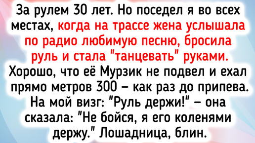 За рулем 30 лет. Но поседел я во всех местах, когда на трассе жена услышала по радио любимую песню, бросила руль и стала "танцевать" руками. Хорошо, что её Мурзик не подвел и ехал прямо метров 300 — как раз до припева. На мой визг: "Руль держи!" — она сказала: "Не бойся, я его коленями держу." Лошадница, блин. © Роман / Dzen Я лежал в детской инфекционной больнице уже будучи студентом. Так получилось, что подцепил "желтуху", врачи забирали ребёнка с района, и меня забрали тоже. Сначала был один в...