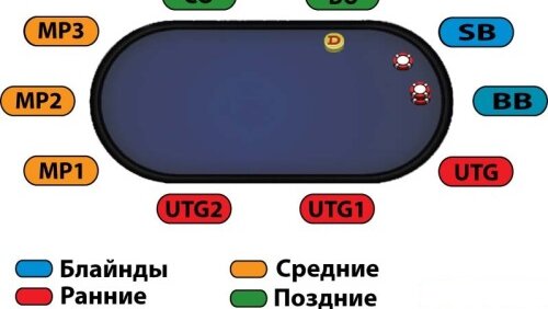Покер это игра решений о совершении ставок на основе не полной информации, и именно позиция определяет ее объем в конкретной раздаче. На основе этой информации Вы будете выбирать диапазон рук, которые будете играть и сможете варьировать стиль игры. SB – малый блайнд BB – большой блайнд UTG – 1-я позиция или позиция «под прицелом» (от англ. «under the gun»). Названа так, потому, что игрок на этом месте, делает ход первым после блайндов, и вынужден принимать решение о ставке, не зная, как походят другие игроки...