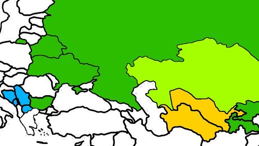 Зелёным показаны страны, где полностью преобладает кириллица...