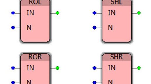 Битовой строкой (bit string) называются данные, представленные в виде двоичной последовательности. Для работы с битовой строкой используются логические и арифметические операции, а также операторы сдвига. Функциональные блоки в среде программирования PC WоrX на языке программирования Function Block Diagram, соответствующие операциям сдвига, представляются элементами ROL, ROR, SHL и SHR: Результатом операции ROL (циклический сдвиг влево) будет битовая строка, полученная перемещением N бит из начала строки в ее конец...