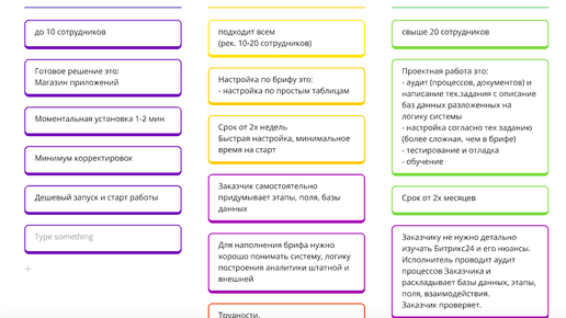 Подготовила для вас таблицу по трём способом внедрения: Здесь не указан ещё один способ по самостоятельной настройке, которую многие начинают выполнять, когда заходят на портал первый раз. Тестируя и изучая систему самостоятельно начинается знакомство с Битрикс. Подробно разберем те варианты, когда вы привлекаете Подрядчиков или исполнителей для выполнения услуги в помощи к настройке Битрикс портала...