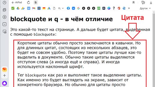 В HTML для выделения в тексте цитат имеются два тега: <blockquote> и <q>. Короткие цитаты обычно просто заключаются в кавычки. Но для длинных цитат, состоящих из нескольких абзацев, это будет не совсем удобно. Поэтому такие цитаты лучше как-то выделить в документе. Обычно цитаты выделяются отступом слева (а иногда ещё и справа). И иногда используется наклонный шрифт. Тег <blockquote> как раз и выполняет такое выделение цитаты. Как именно это будет выглядеть на экране, зависит от конкретного браузера...