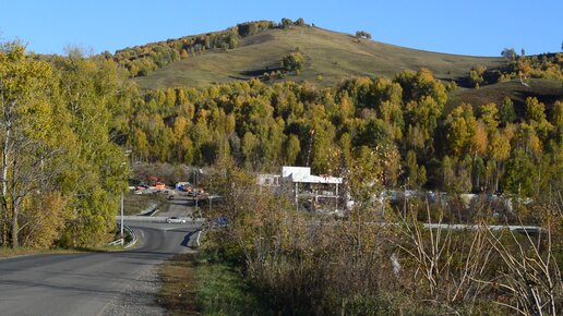 Вертолёт ,солнечные батареи -электростанция, стройка вдалеке, трасса и яркие краски осени.Красота.