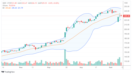 Здравствуйте, друзья мои! Рассмотрим сегодня такой индикатор технического анализа, как полосы (линии) Боллинджера или Bollinger Bands (англ.). Bollinger Bands совмещает в себе трендовый индикатор, индикатор волатильности и осциллятор. Состоит из трёх полос. Средняя линия - скользящая средняя (по умолчанию в терминале от TradingView SMA20), верхняя и нижняя линии - эта же скользящая средняя, только со среднеквадратичным отклонением (по умолчанию в терминале от TradingView среднеквадратичное отклонение равно 2)...