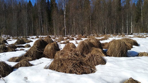 На Вербное Воскресенье состоялась прекрасная теплая, солнечная погода. Собираясь дома я взял с собой ароматный черный чай "Ричард" в термосе, жаренные пельмени, яблоко, черный хлеб и сложились все это в свой 80 - и литровый походный рюкзак. Мой проезд на даче полностью растаял, и я доходя до леса я нес на себе рюкзак, бур и сани волокуши. Затем, дойдя до плотного бураньего следа уместил все в сани и поводок за собой, облегчив при этом свой груз. Сначала я увидел высокие, выросшие из снега желто-коричневые болотные кочки...