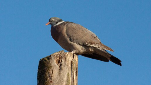 Вяхирь (Columba palumbus) – это такой увеличенный в размерах сизый голубь с белыми пятнами на шее и поперечными белыми полосами на крыльях. Другое его название в русском языке – витютень. Ранее он всегда ассоциировался с абсолютно дикой птицей, избегающей человека. Однако в Западной Европе вяхирь давно уже живет в городах, у нас же процесс его синантропизации (тенденция к обитанию рядом с человеком) идет медленнее, но идет! Например, этот вяхирь подпустил нас довольно близко в одном селе Нижегородской области...