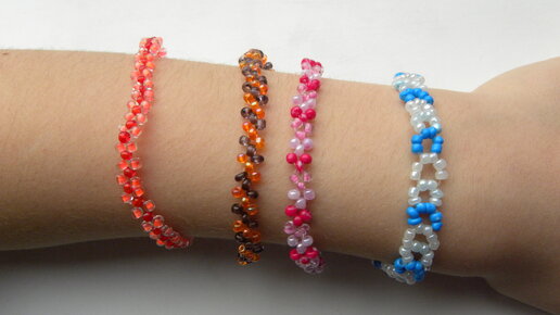 Браслет это красивое украшение для девушек. В этой статье я расскажу о том как сплести один из таких красивых, но простых браслетов. Нам понадобятся: Набираем на проволоку 4 шт. и одним из концов проходим через последнюю набранную бисеринку в обратном направлении. Должен получится небольшой ромбик. Набираем на один из концов по одной бисеринке одного цвета и ещё одну шт. на один из концов проволоки. Другим концом проволоки проходим через эту последнюю набранную бисеринку в обратном направлении...