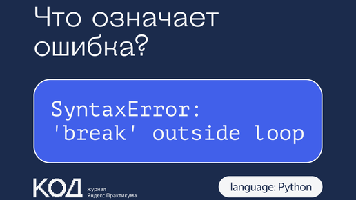 Ситуация: мы пишем опросник на Python, и нам важно, чтобы его мог пройти только совершеннолетний. Для этого мы добавляем в код такую логику: На Python это выглядит так: Вроде всё логично, но после запуска мы получаем ошибку: SyntaxError: 'break' outside loop Что это значит: в отличие от многих других языков, команда break в Python используется только для выхода из цикла, а не выхода из программы в целом. Когда встречается: когда мы хотим выйти из программы в середине её работы, но не знаем как...