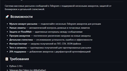 🚀 Telegram Broadcaster — Локальный сервис массовых рассылок в личные сообщения 📋 О проекте Telegram Broadcaster это полнофункциональный инструмент для автоматизированной рассылки сообщений в личные сообщения Telegram. Проект разработан на Python с использованием современного асинхронного стека и предназначен для маркетологов, предпринимателей и команд, которым необходимо эффективно коммуницировать с аудиторией через Telegram. Система работает локально на вашем компьютере, что обеспечивает полный контроль над данными и исключает зависимость от сторонних сервисов...