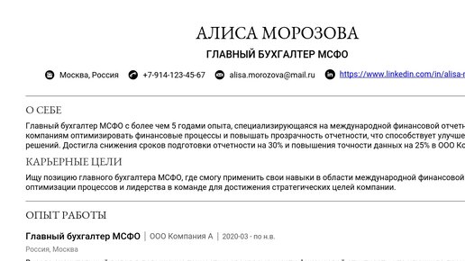 Пример резюме главного бухгалтера МСФО 2025 - Как составить