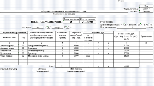 Штатное расписание — нормативный документ предприятия, оформляющий структуру, штатный состав и численность организации с указанием размера заработной платы в зависимости от занимаемой должности. Так как штатное расписание - бланк унифицированной формы Т-3 , то порядок его заполнения утверждены постановлением Госкомстата РФ от 05.01.2004 № 1 Штатное расписание содержит: * наименование и номер документа; * дата его составления; * наименование компании; * подтверждение факта осуществления деятельности...