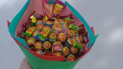 Такой подарок подойдёт как и девушке так и ребенку. Хорошая альтернатива цветам. Лично я радовал свою девушку таким сюрпризом. Для этого нужно: Каждый чупик насаживает на шпажку и обманываем скотчем (так будет надёжнее держатся. После того как все насадили. Начинаем связывать их скотчем. Советую на один моток скотчем прикреплять одну шпажку...