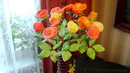 Что нам понадобится: Итак, берём лист цветной бумаги (каким цветом у вас будут розы, я взяла красный) разрезаем ее на полосы 13×1 см, затем берём лист зелёной бумаги и режем прямоугольники размером 5,5×3 и лист синей бумаги размером 7×7. Сколько хотите роз сделать, столько полосок и нужно Берём красную полоску и начинаем ее по диагонали скручивать Скручиваем розу, меняя положение скручивание прямо и по диагонали как показано на фото Как скрутили розу, формируем ее в бутон...