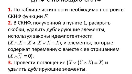 В лекции сформулируем основные понятия, связанные с булевыми функциями, а также представим алгоритм построения сокращённой булевой функции. Заметим, что: Способы задания булевых функций Способ 1. При задании булевых функций удобно пользоваться таблицами истинности, которые перечисляют всевозможные комбинации истинности и ложности булевых функций: Минимизация дизъюнктивных нормальных форм Определение. Булеву функцию G назовем импликантом булевой функции F, если для любых наборов значений аргументов этих функций из равенства G = 1 следует равенство F = 1...