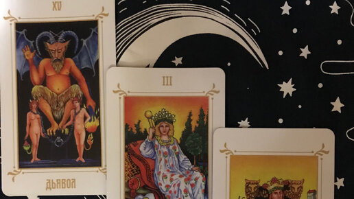 Посмотрим, на вашего мужчину: стабильный или нет, в отношениях, в жизни, всё ли так гладко? расклад выглядит так: Карта дьявол, говорит о порочности, влечению по дьяволу, страсти! Но! Следующая карта- императрица, и это не вы! Увы, но! всё по порядку! давайте посмотрим на вашего мужчину? начнём расклад с обратной стороны и значение, понимание карт при данном раскладе. Мужчина может быть, по знаку зодиака- овен, телец, козерог, но это не обязательно, может означать сильный характер, мужской стержень...