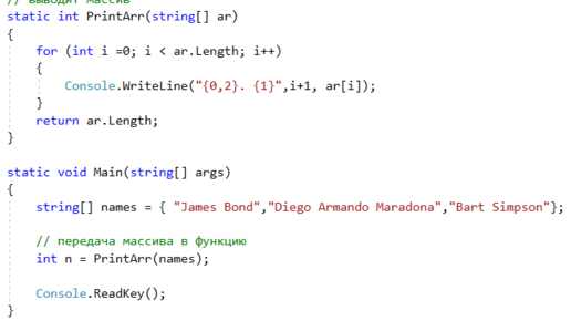 В качестве параметра функции можно использовать массив. Следующий фрагмент кода показывает, как объявить и вызывать функцию, у которой один из параметров - массив. Функция PrintArr выводит на консоль содержимое строкового массива ar в виде пронумерованного с единицы списка...